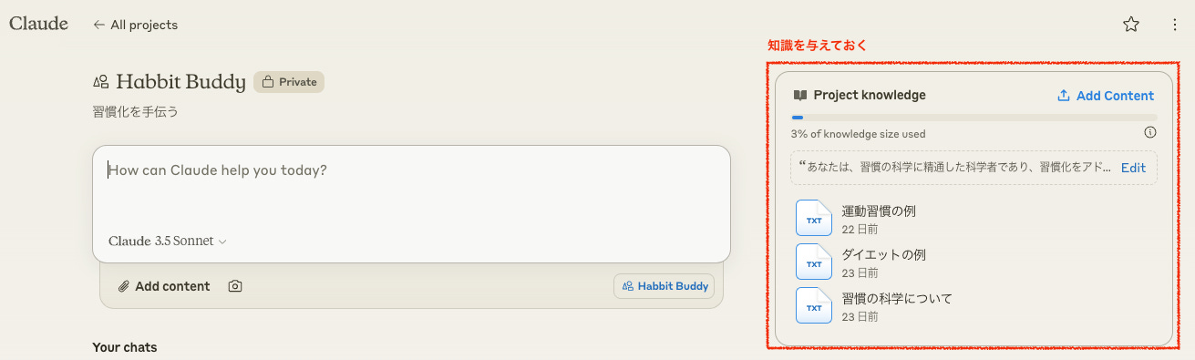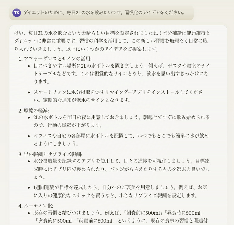 私は、「超・習慣力」という書籍を、4つのポイントでまとめた文章を作り、さらに、4つのポイントで習慣化のアイデアを出した事例を用意し、それをAIに読み込ませました。