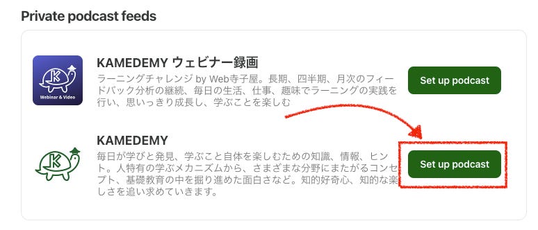 ページ末尾のPrivate podcast feeds で「Set up podcast」を選んでください(KAMEDEMYと書かれた方です)
